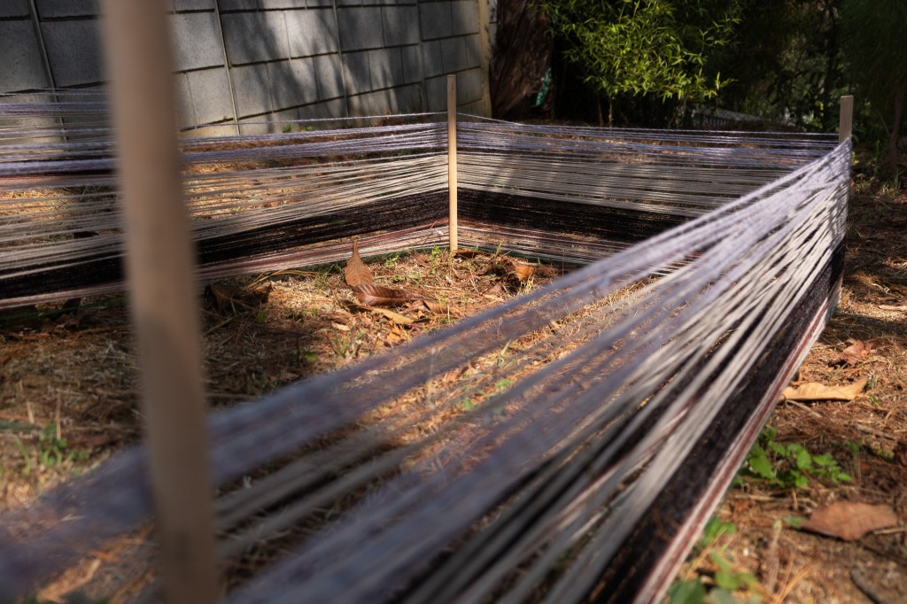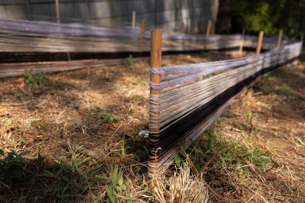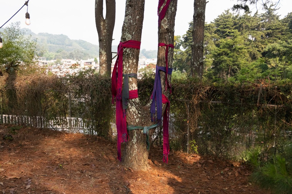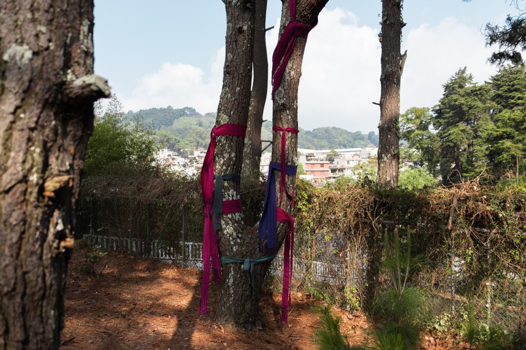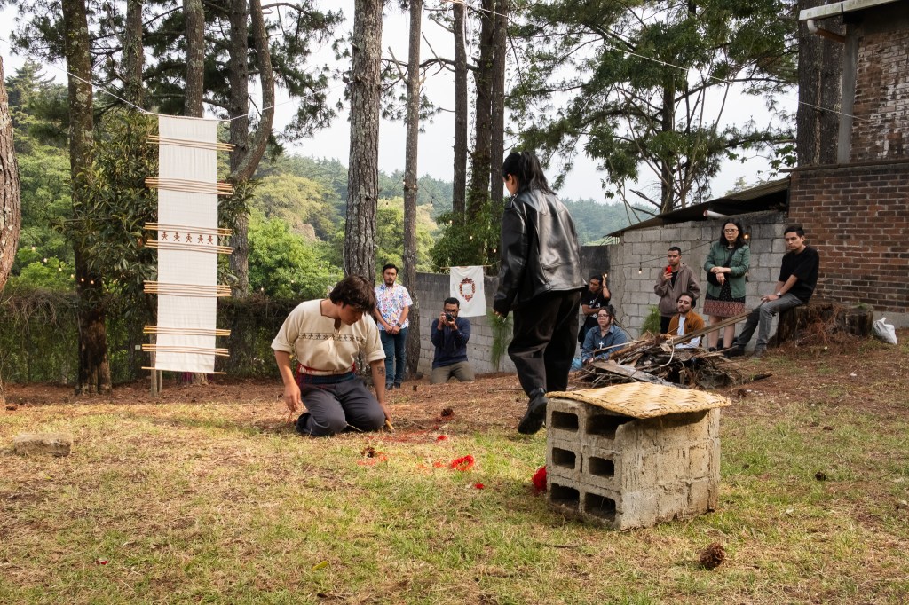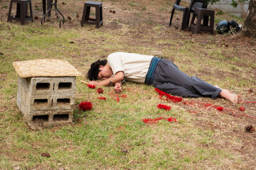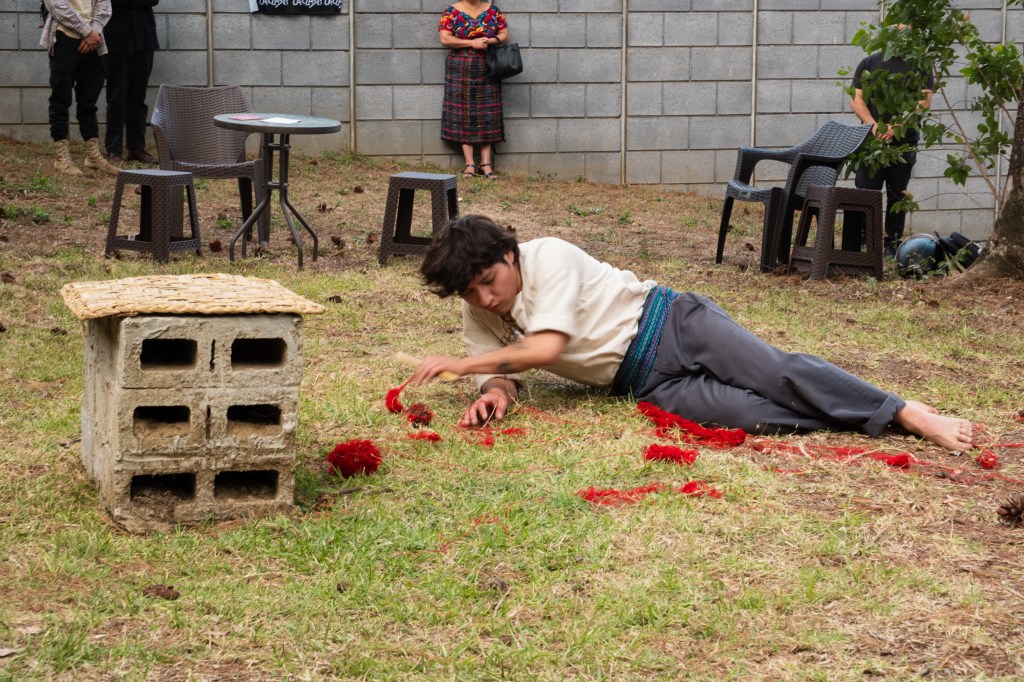 Hilar aquí no es un gesto mecánico, sino un acto activo que transmite saberes y sostiene vínculos con el pasado. Jeff retoma estos conocimientos ancestrales para abrir portales de memoria, abrazando árboles con fajas como ancestros y sembrando hilos como milpa. De esta manera, no solo hila narrativas, sino que teje espacios de pertenencia, memoria y vida compartida.”