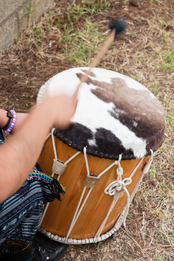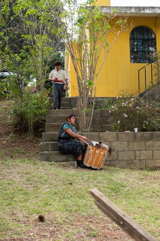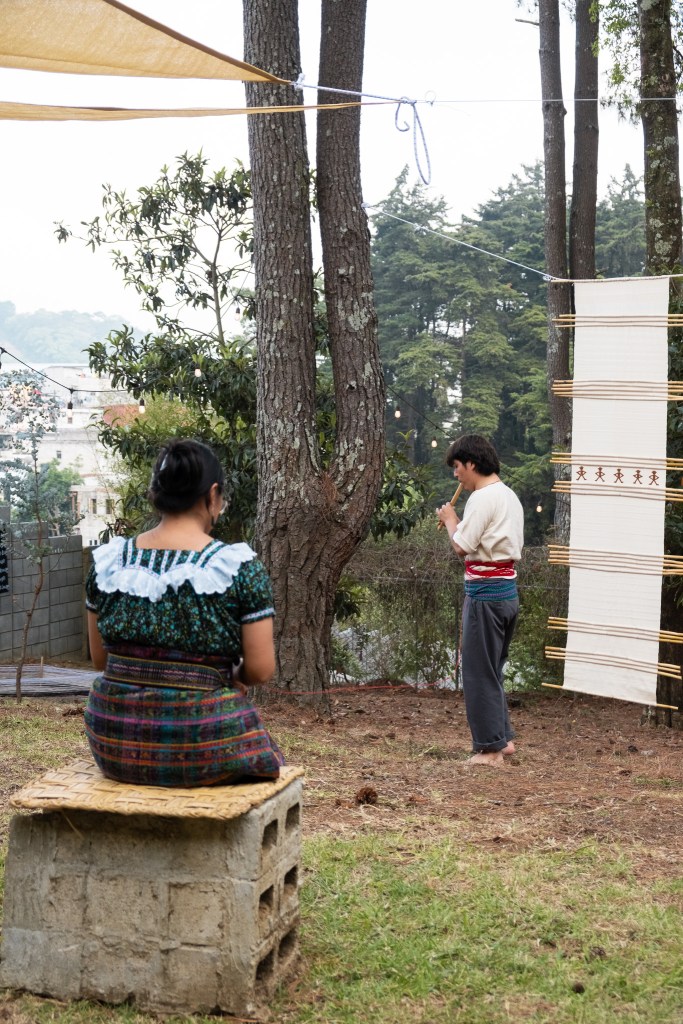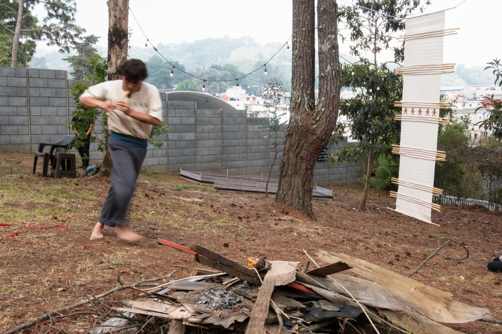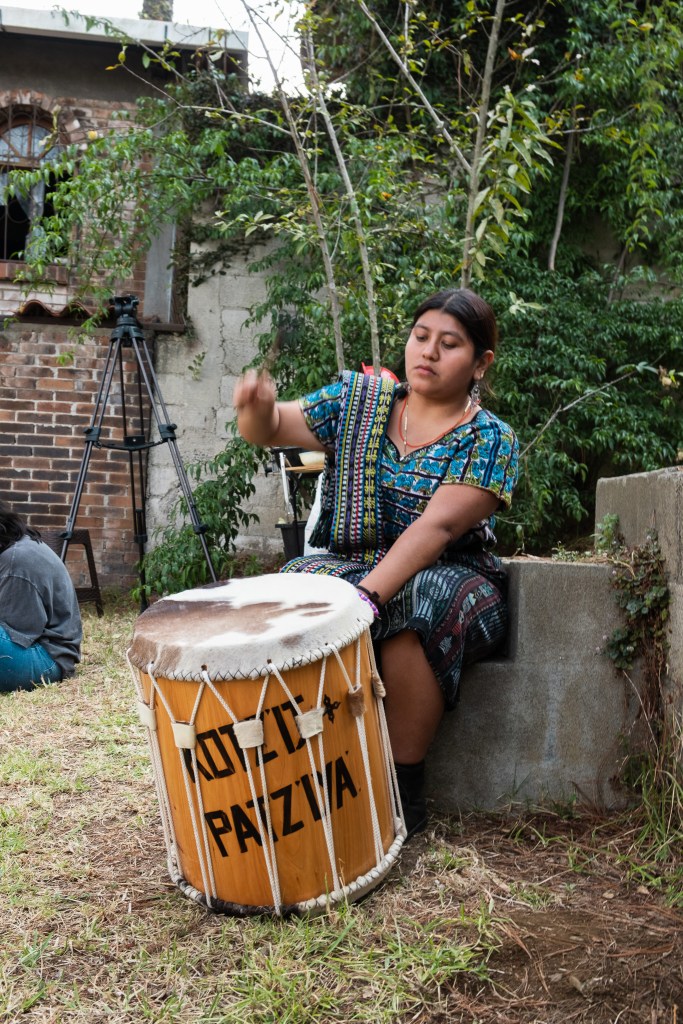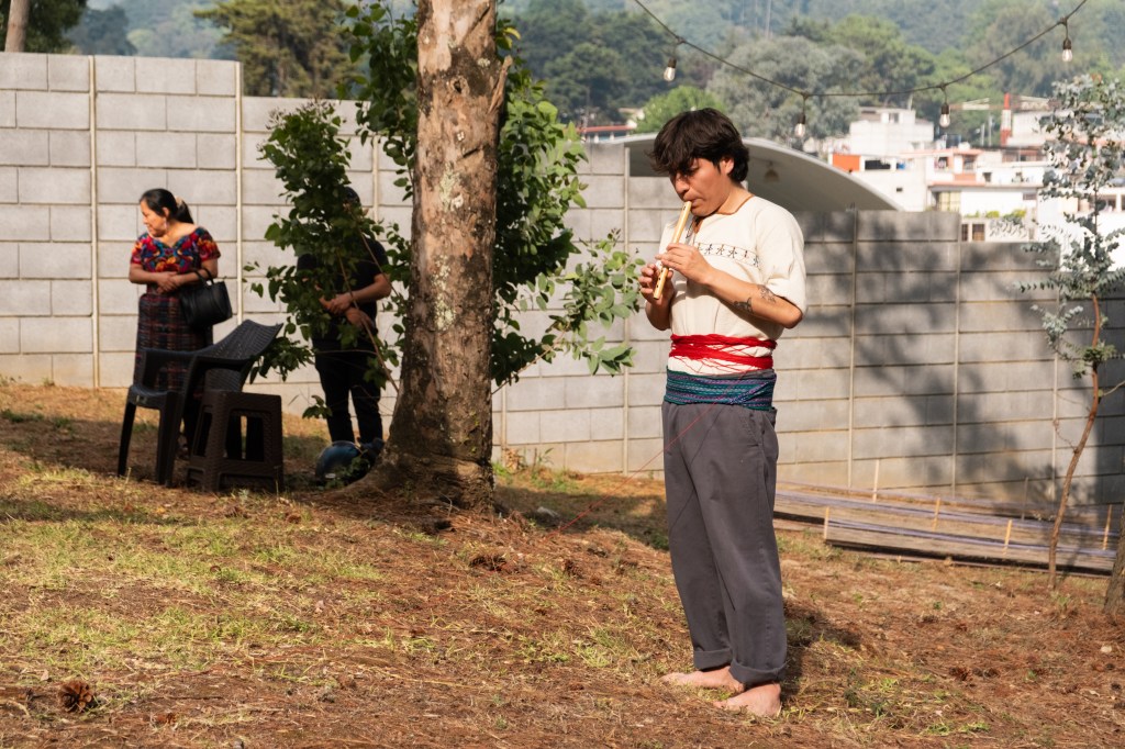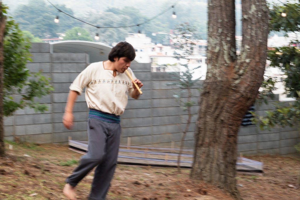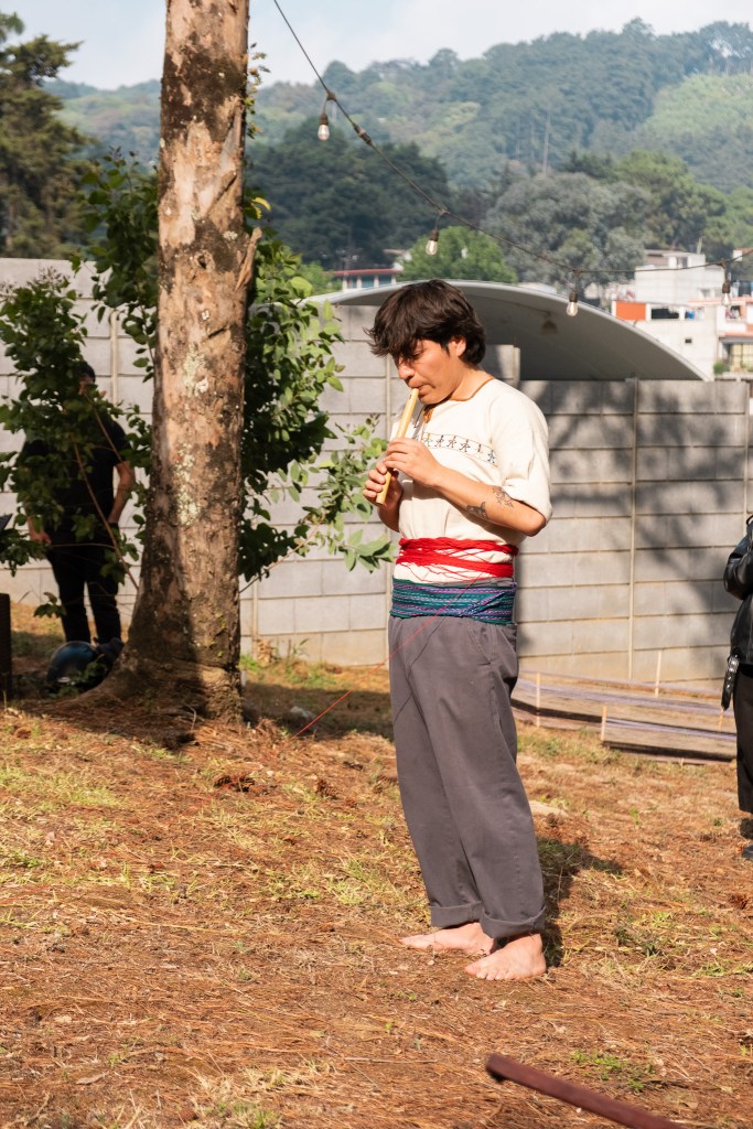 Mientras daba vueltas (invocando a la creación), el artista ejecutaba una melodía tradicional kaqchikel, que se ejecuta en el baile de la conquista (baile tradicional de su pueblo que relata el proceso de violencia y colonizaciones por parte de los españoles a los k’iche’)